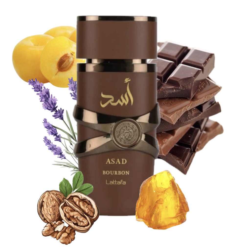 Asad Bourbon de Lattafa Perfumes es una fragancia de la familia olfativa Oriental Especiada para Hombres. Esta fragrancia es nueva. Asad Bourbon se lanzó en 2025. Las Notas de Salida son lavanda, ciruela Mirabel y pimienta rosa; las Notas de Corazón son cacao, nuez moscada y Davana; las Notas de Fondo son vainilla Bourbon, ámbar y vetiver.