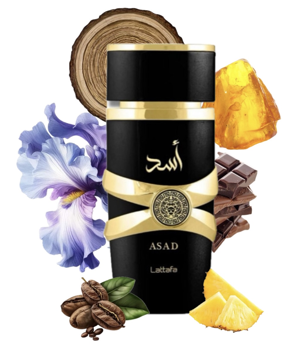 Asad de Lattafa Perfumes es una fragancia de la familia olfativa Oriental para Hombres. Asad se lanzó en 2021. Las Notas de Salida son pimienta negra, tabaco y piña; las Notas de Corazón son pachulí, café y iris; las Notas de Fondo son vainilla, ámbar, Madera seca, benjuí y ládano.