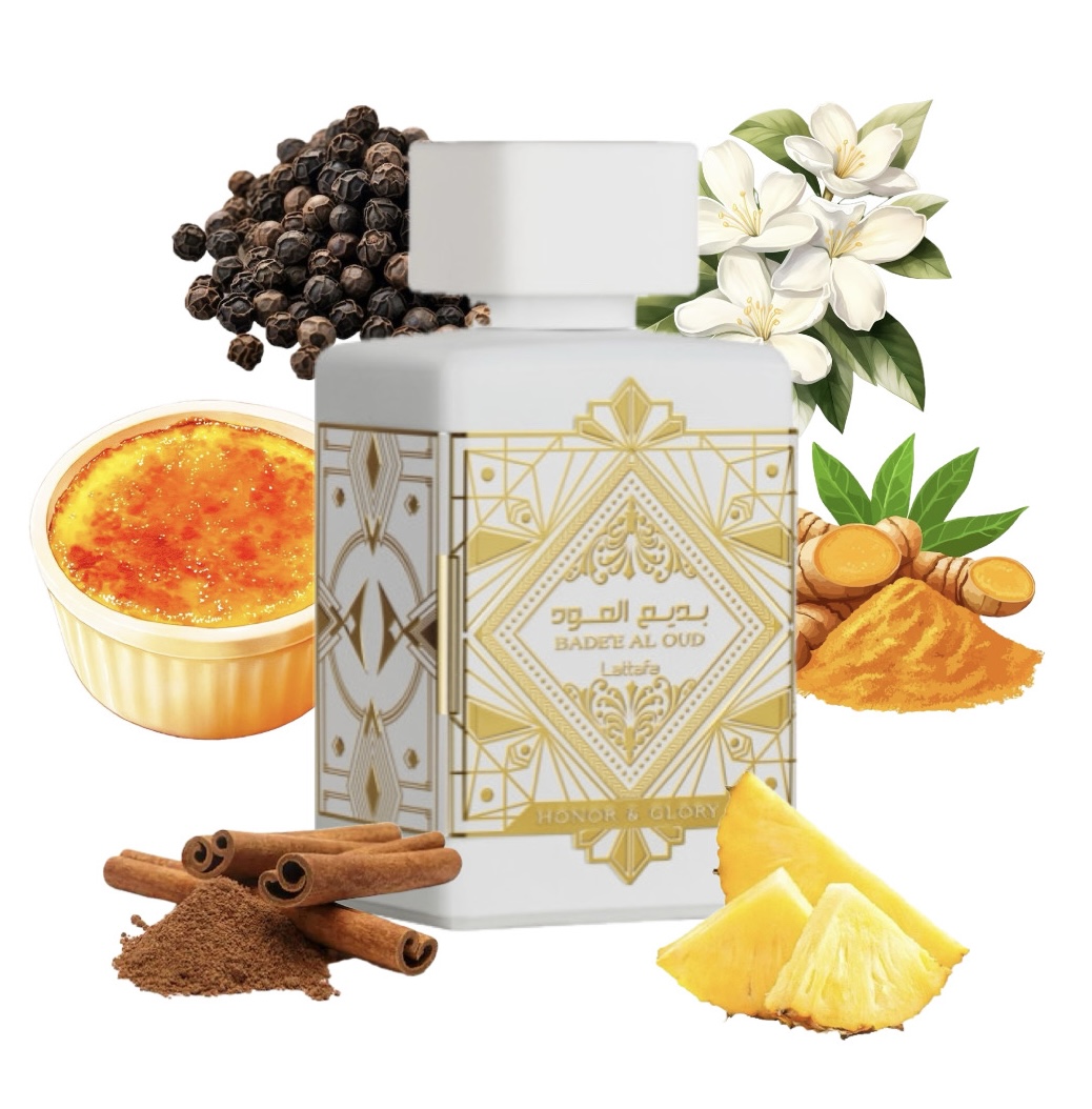 Bade’e Al Oud Honor & Glory de Lattafa Perfumes es una fragancia de la familia olfativa para Hombres y Mujeres. Esta fragrancia es nueva. Bade’e Al Oud Honor & Glory se lanzó en 2023. Las Notas de Salida son piña y créme brulée; las Notas de Corazón son canela, cúrcuma (azafrán de la India), pimienta negra y benjuí; las Notas de Fondo son vainilla, sándalo, cachemira y musgo.