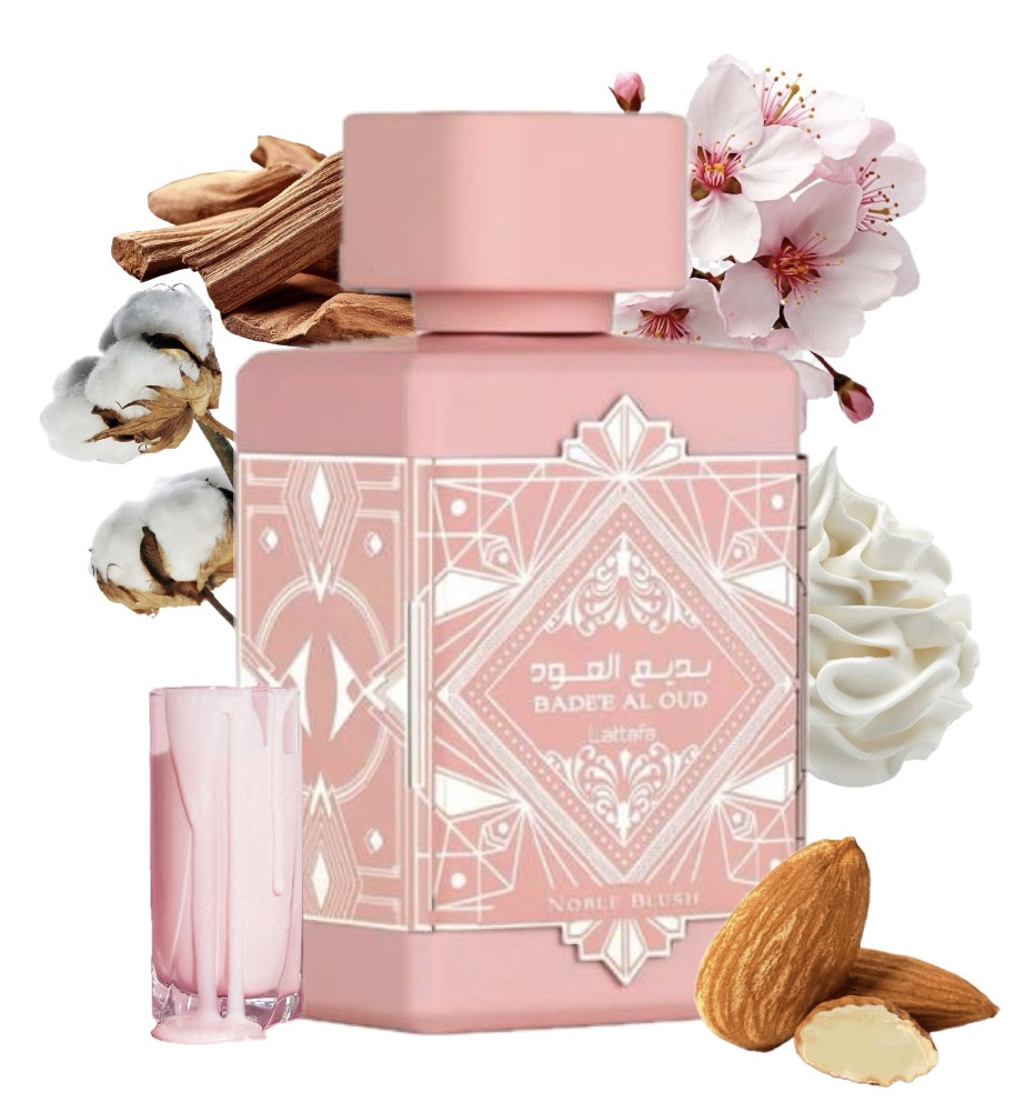 Noble Blush de Lattafa Perfumes es una fragancia de la familia olfativa Floral Frutal Gourmand para Mujeres. Esta fragrancia es nueva. Noble Blush se lanzó en 2024. La Nota de Salida es Rose Milk; las Notas de Corazón son merengue y almendra; las Notas de Fondo son vainilla, almizcle y sándalo.