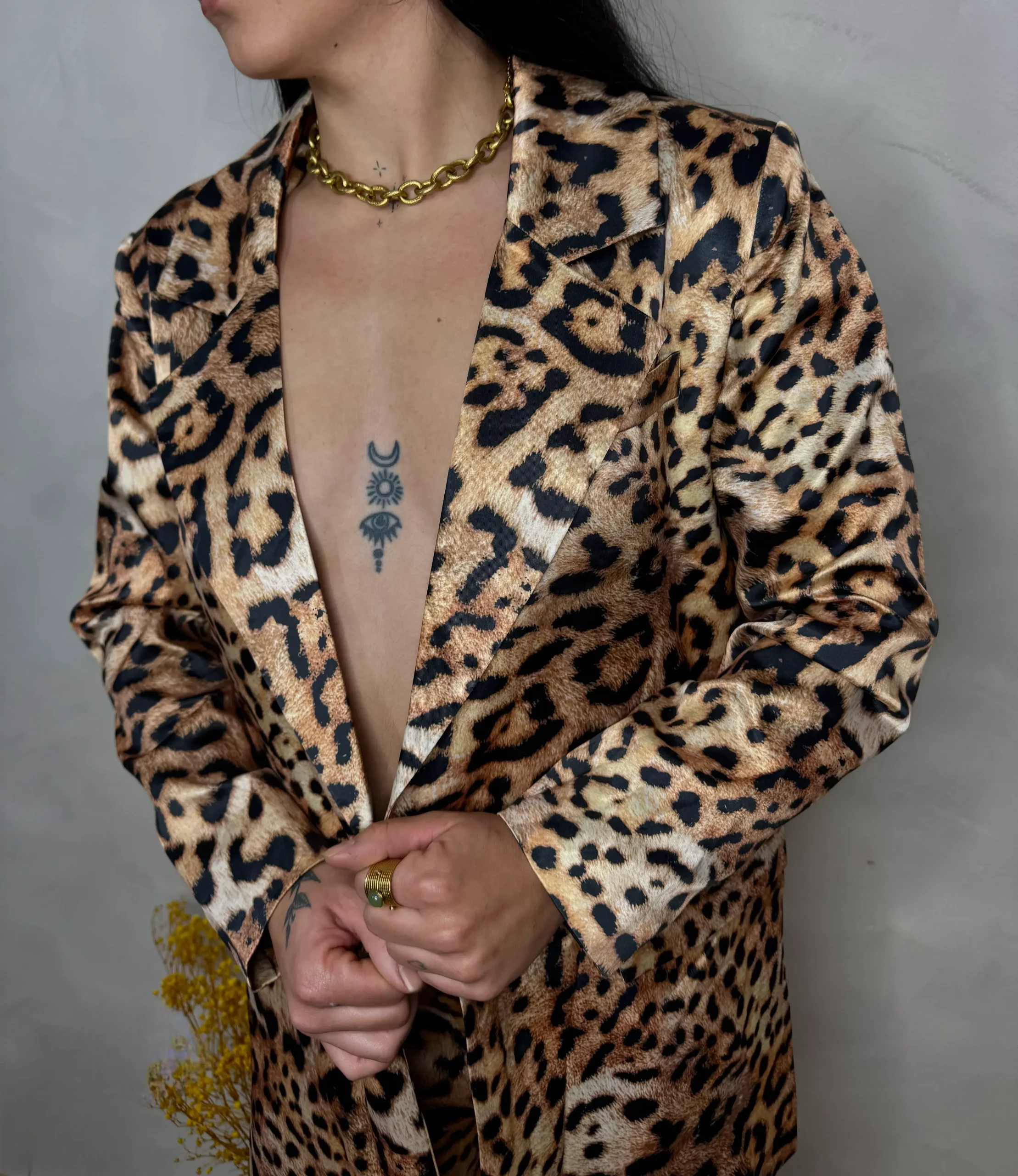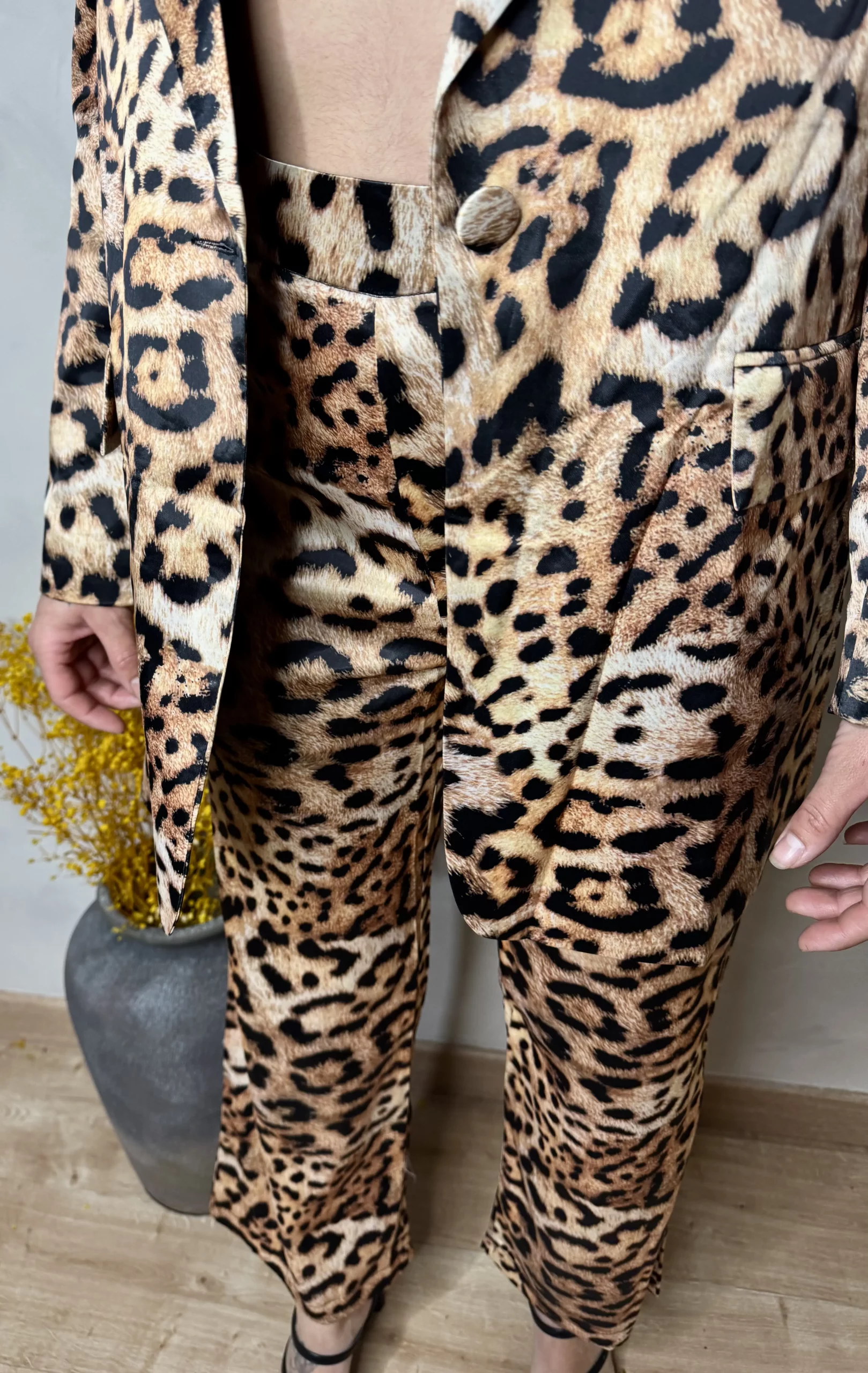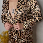Atrevimiento y glamour en una sola prenda. Este conjunto de blazer y pantalón con estampado animal print es la opción perfecta para quienes aman destacar con estilo.