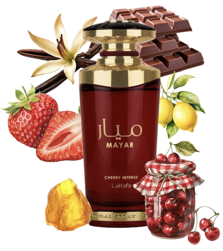 Mayar Cherry Intense de Lattafa Perfumes es una fragancia de la familia olfativa Oriental Vainilla para Hombres y Mujeres. Esta fragrancia es nueva. Mayar Cherry Intense se lanzó en 2024. Las Notas de Salida son fresa y bergamota; las Notas de Corazón son Cherry Jam y cacao; las Notas de Fondo son vainilla, ámbar y pachulí.