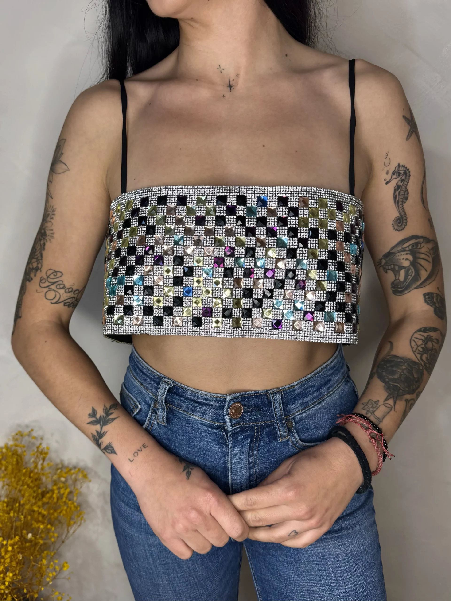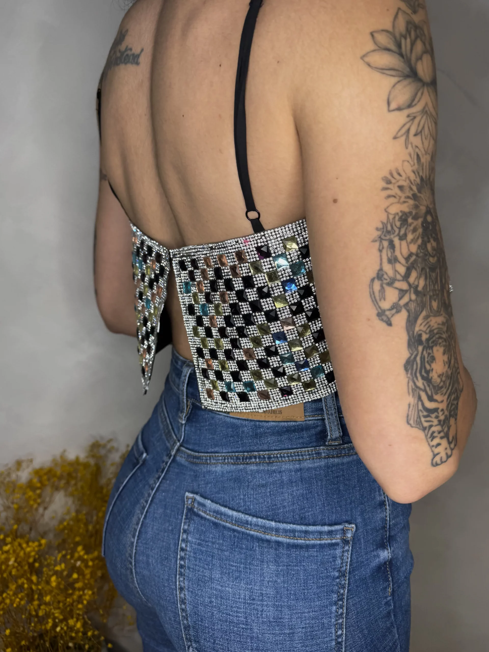 Con este top de strass en difernetes colores con un únco cierre en la espalda te dará el toque perfecto para marcar la diferencia.