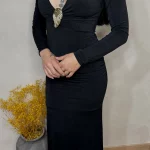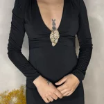 Vestido largo de noche negro con hombreras que le da un toque sofisticado. Su broche central dorado hace que marques la diferencia en cualquer evento.